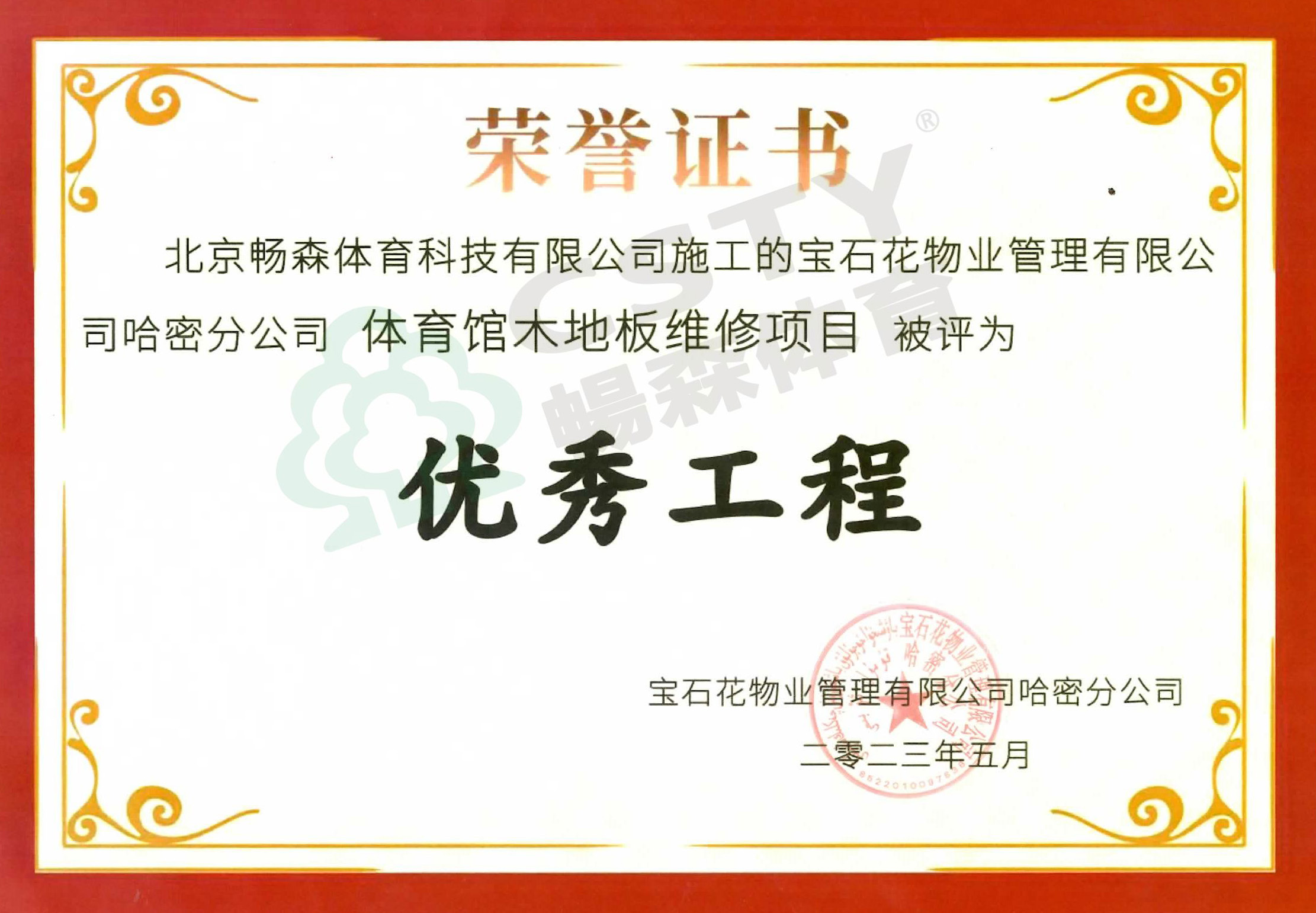 榮譽證書| 暢森體育獲寶石花物業(yè)管理有限公司哈密分公司授予“優(yōu)秀工程獎”