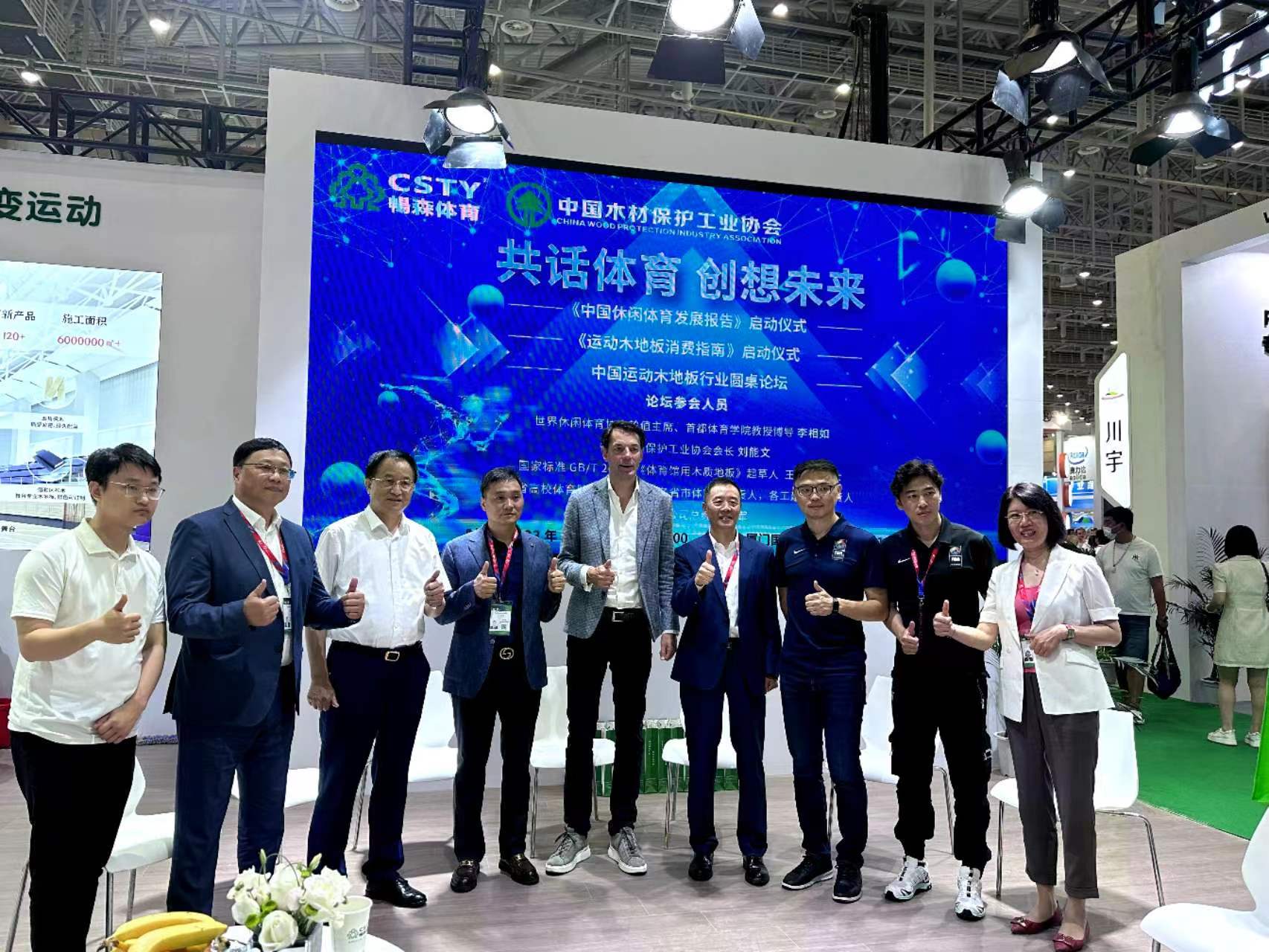 會上以暢森體育董事長趙軍為發(fā)起人舉辦了國際化體育圓桌論壇會議:以共話體育 創(chuàng)想未來為主題邀請了,世界休閑體育協(xié)會輪值主席、首都體育學(xué)院教授博導(dǎo) 李相如、FIBA器材和場地認(rèn)證中心主管 Bart,F(xiàn)IBA中國區(qū)負(fù)責(zé)人總經(jīng)理方亮、中國木材保護(hù)工業(yè)協(xié)會會長 劉能文、國家標(biāo)準(zhǔn)GB/T 20239《體育館用木質(zhì)地板》起草人 王宏棣博士各位專家蒞臨現(xiàn)場,就如何辯證看待中國體育發(fā)展之路展開深入研討交流,共話體育產(chǎn)業(yè)未來發(fā)展之路。并在各位專家學(xué)者及業(yè)內(nèi)知名人士的關(guān)注、指導(dǎo)下啟動了《運(yùn)動木地板消費(fèi)指南》業(yè)內(nèi)專業(yè)書籍編寫儀式。為體育行業(yè)發(fā)展、為體育行業(yè)消費(fèi)者提供更專業(yè)的服務(wù),將進(jìn)一步促進(jìn)體育行業(yè)的健康可持續(xù)發(fā)展。