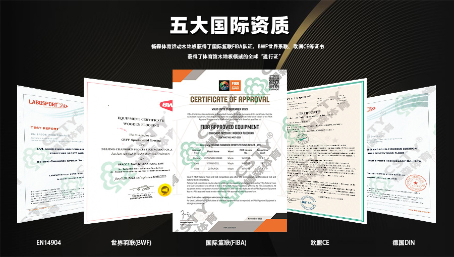 暢森體育運(yùn)動木地板通過國際籃聯(lián)FIBA、世界羽聯(lián)BWF、歐盟CE、德國DIN、EN14904檢測等五大權(quán)威機(jī)構(gòu)認(rèn)證,可廣泛應(yīng)用于各種級別的競技場館、大中小學(xué)校運(yùn)動場館、公共或個人訓(xùn)練或休閑場館,已為超過10000個運(yùn)動場館提供建設(shè)服務(wù)。